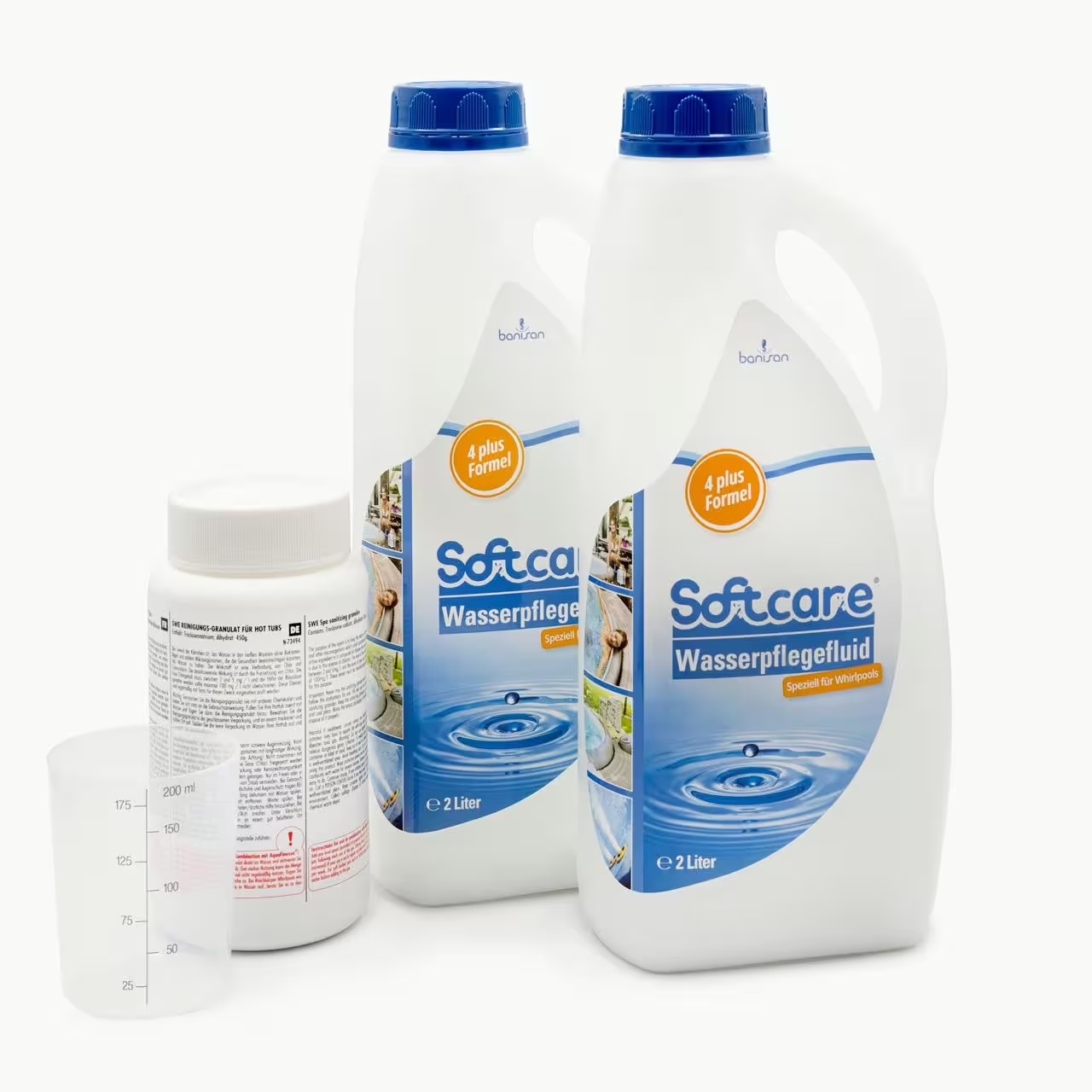 - 2 x 2 Liter Softcare Wasserpflege, 1 x 450 g Chlorgranulat und Messbecher