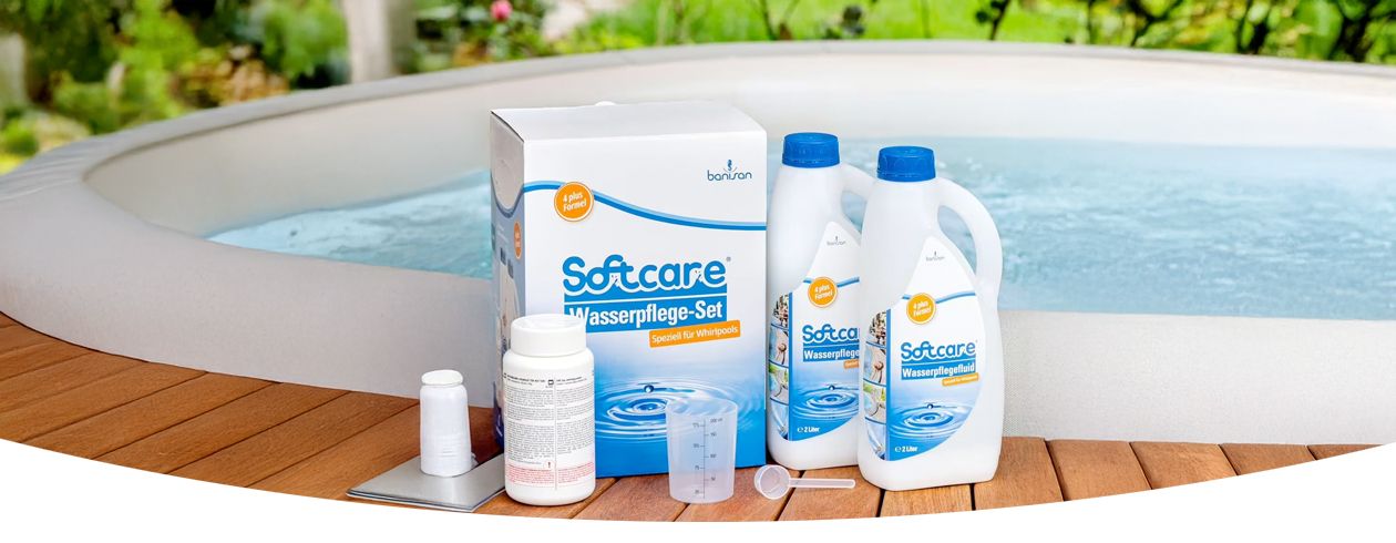 - 2 x 2 Liter Softcare Wasserpflege, 1 x 450 g Chlorgranulat und Messbecher